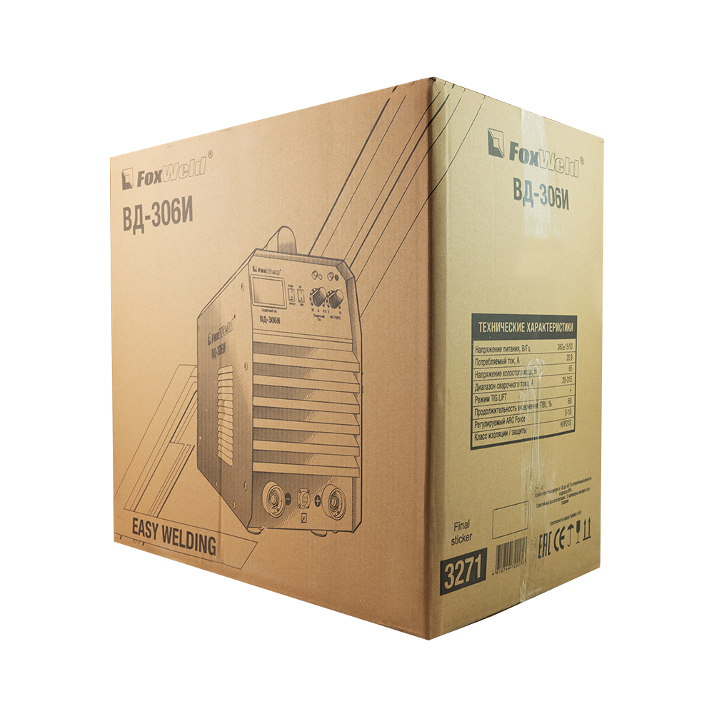 Регулировка форсажа дуги (контроль стабилизации дуги). Горячий старт, антизалипание. Разъем под пульт ДУ. MMA, TIG Lift, панельные розетки 35 мм2, напряжение питания: 380В±15%, Диапазон сварочного тока: 20-315А, ПВ: 60%, ручка для переноски, комплектация: кабели 3 м, электрододержатель, клемма заземления. Вес - 15,5 кг